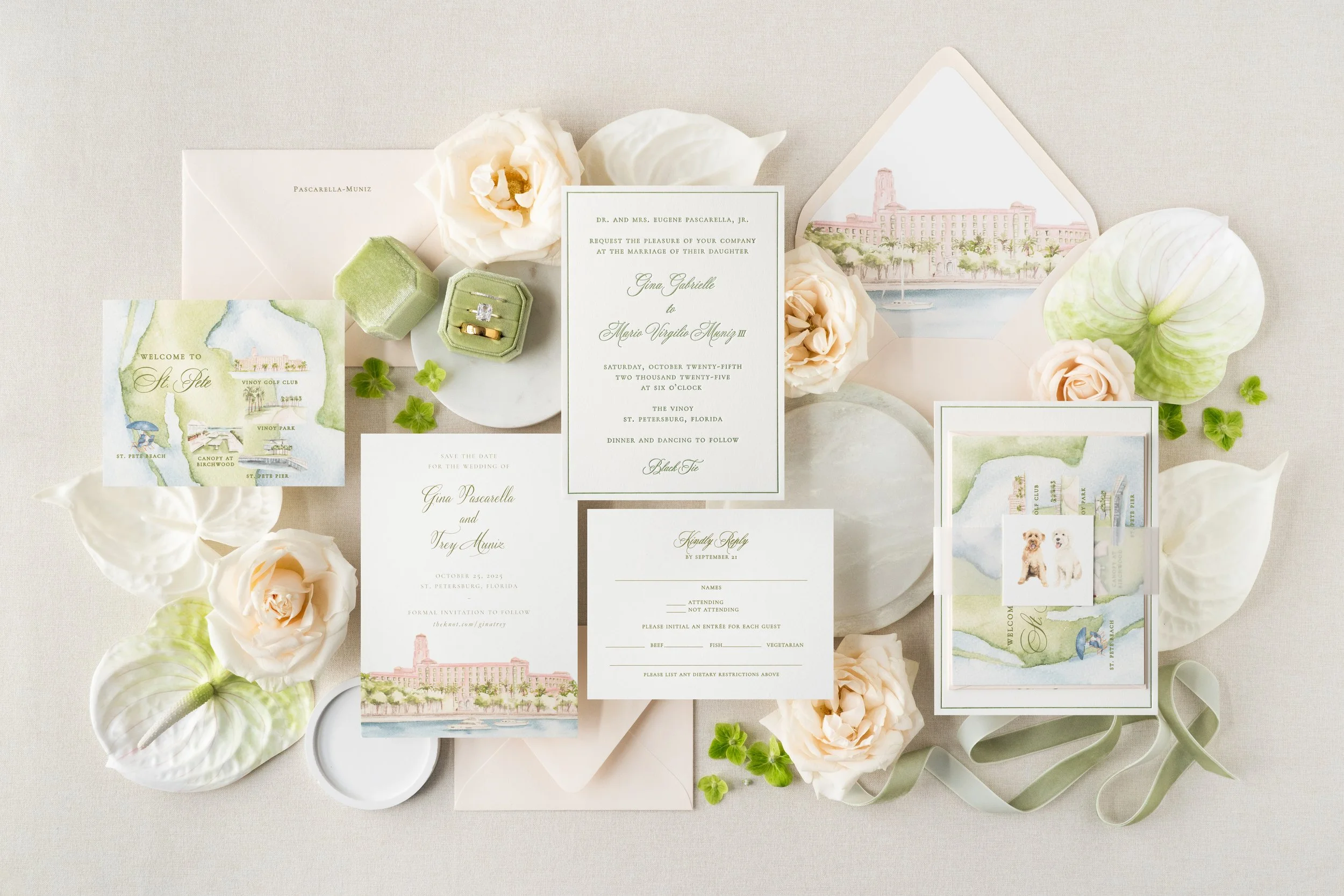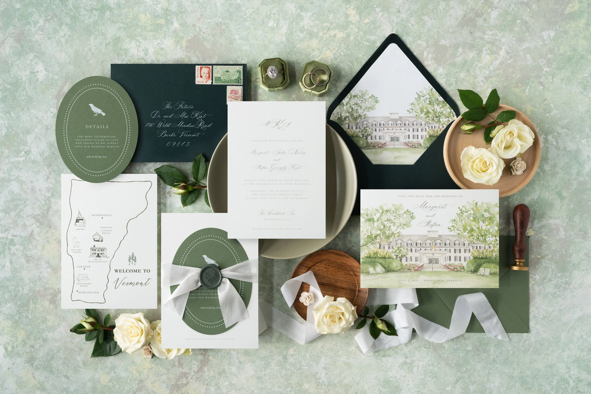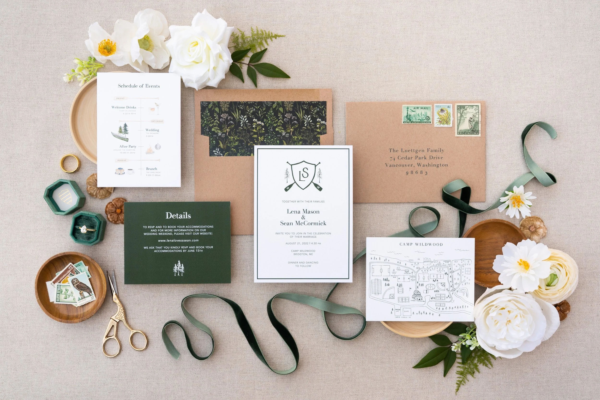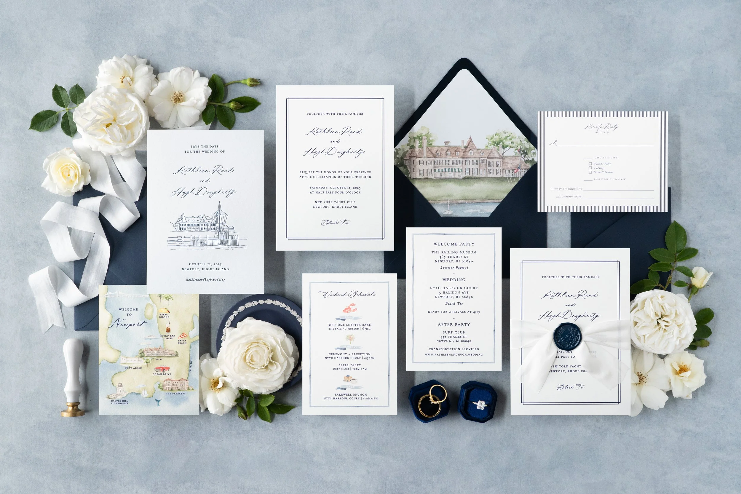 Consultation + design calls, custom artwork, color matching, invitation assembly and mailing, and specialty printing are reserved exclusively for our custom projects.