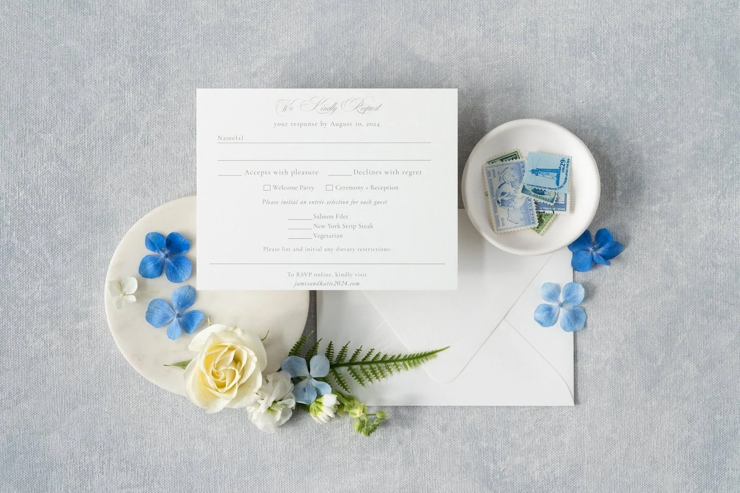 Purpose: Guests use this card to confirm attendance and provide any necessary details (meal choices, plus-one confirmations, etc.). In recent years, we’ve seen a shift in most couples opting to forgo the traditional mail-in RSVP with envelopes in favor of an insert card directing guests to the website to RSVP.